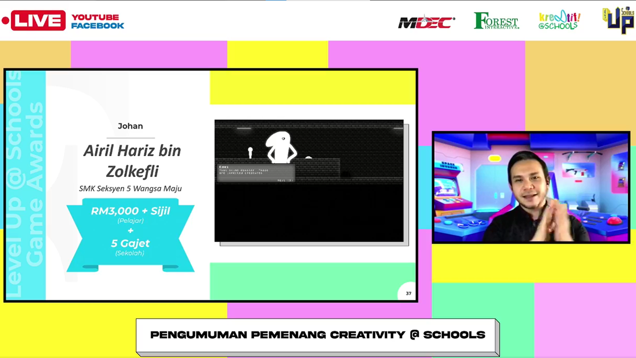 The competition was split into two categories – animation and games. Adam Auza’i Bin Mohamad Zaper of SMK Syed Saffi, Perlis, grabbed first place in the animation category (Kre8tif! @ Schools Animation Awards) while Airil Hariz bin Zolkefli of SMK Seksyen 5 Wangsa Maju, Kuala Lumpur, was the winner of the games category (LEVEL UP @ Schools Game Awards).