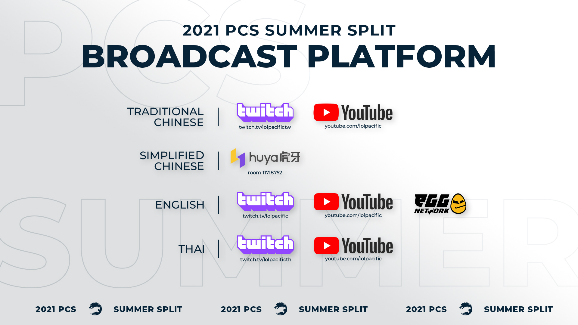 Riot Games Southeast Asia, Carry Live Co., and Garena have announced the 2021 Summer Split of the Pacific Championship Series (PCS) presented by CTBC and China Airlines, to commence on 9 July 2021. The Summer split will continue with the same ten teams from the Spring Split.