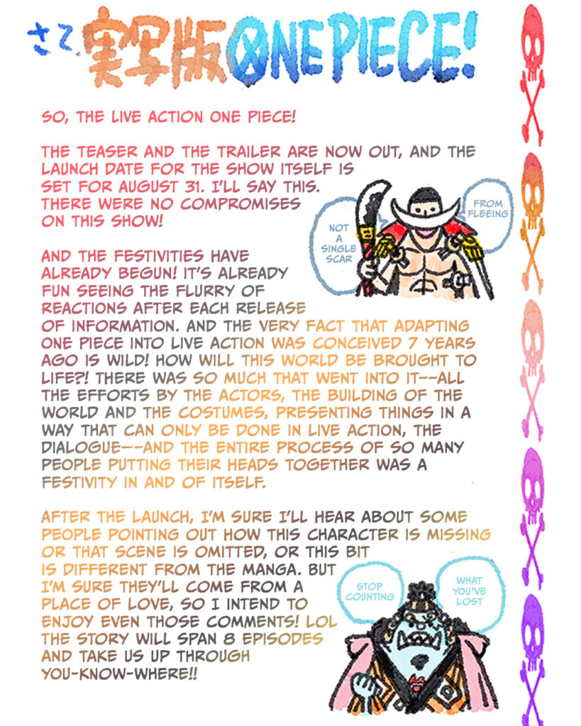 Eiichiro Oda, creator of the One Piece manga, also shared his thoughts on the live-action adaptation, the production, changes from the manga, and the cast and crew.