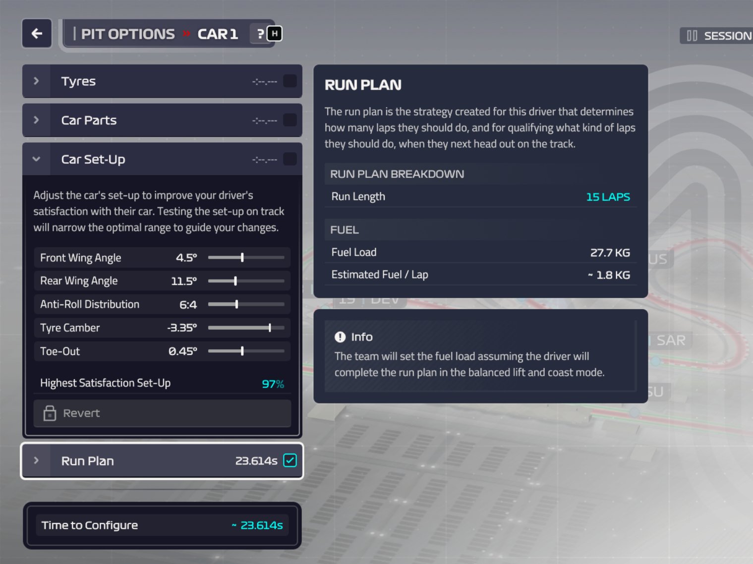 Preparations for each session can be either done manually or simulated entirely. This covers the whole gamut of race preparations, from the super meticulous borderline-obsessive attention to detail to the totally negligent who clicks on the ‘Simulate Session’ more often than Carlos Sainz blaming others for his crash.