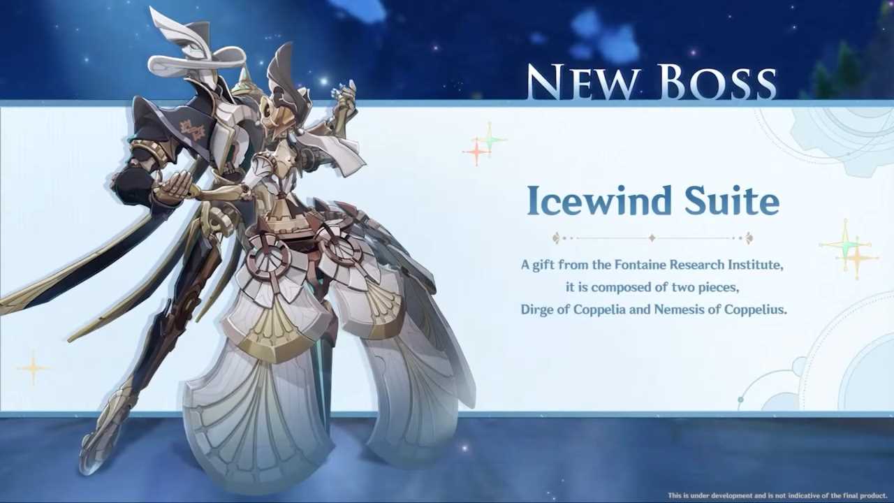 There’s some cool stuff waiting for you in Fontaine, including new bosses to take on. The first boss you’ll face is called “Icewind Suite,” and it’s a total masterpiece of Fontaine’s clockwork tech and art scene. This boss is like a pair of dancing clockwork mekas – real showstoppers!