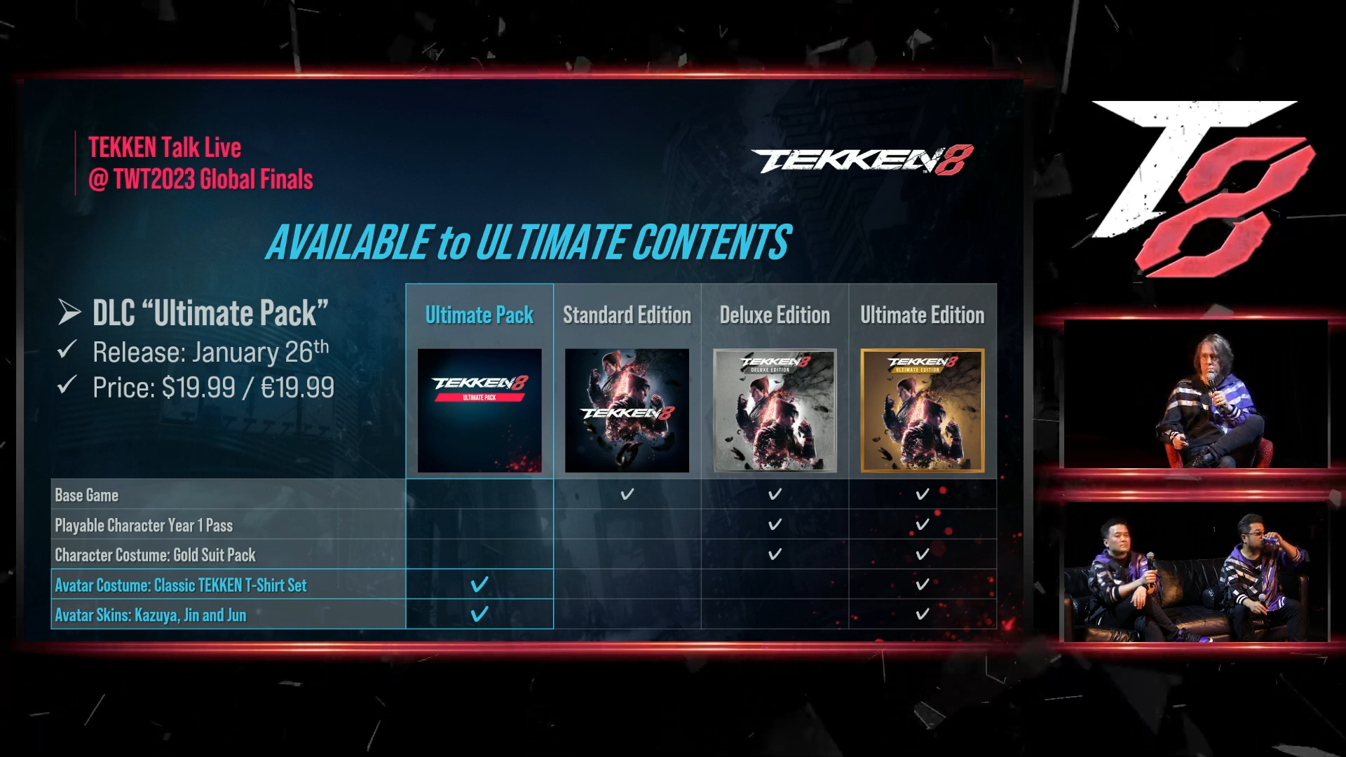 In a Tekken 8 presentation featuring producers Katsuhiro Harada and Michael Murray, they showed off the Standard, Deluxe, and Ultimate versions of the game, with different bonuses. You can buy the Ultimate Pack separately for US$19.99 which gives you the Kazuya, Jin, and Jun Avatar Skins.