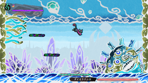 The player controls the cat Kuon as she searches for a way to open the “Boundary” to the mortal world and return home. The dangerous terrain and frightful fiends of the Soulplane present a near-impossible challenge for a mere house cat. Any single hit to the tiny feline means instant death.