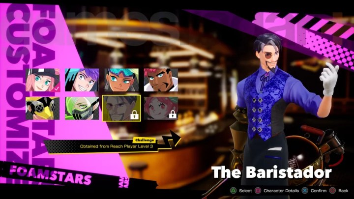 …pick the Baristador. He can only be unlocked if your Player Level is at 3. He’s worth levelling up for, as he has a wide spread and long-ranged weapon that coats the field with foam pretty efficiently when compared with the rest of the cast.