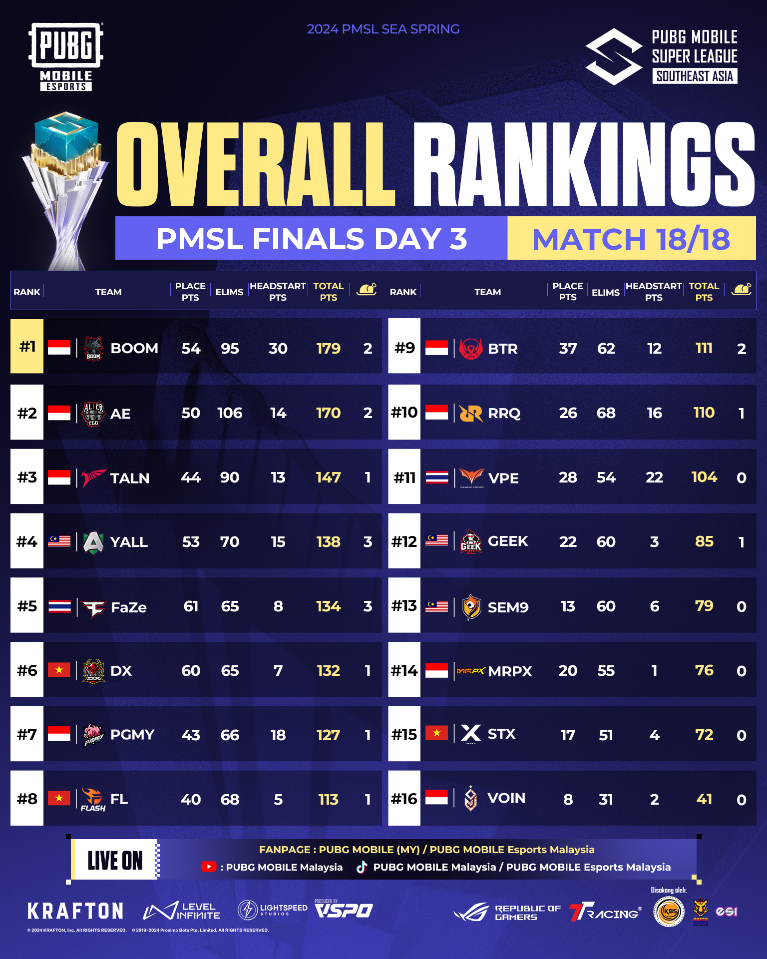 BOOM Esports clinched the championship trophy in the PUBG Mobile Super League Southeast Asia (PMSL SEA) Spring 2024. They emerged victorious in the Grand Final on 17 March, accumulating the highest total points of 179, surpassing 15 other teams from various parts of Southeast Asia.