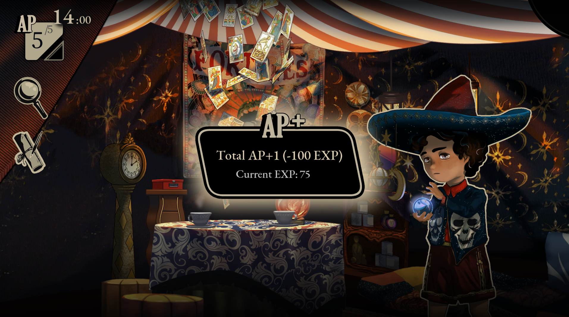 At first you start with 5, but luckily, you meet Tito the fortune teller who will help increase these AP. How? Well, by trading 100 XP for 1 AP! But how do you get XP? It’s pretty simple: complete your tasks at hand!