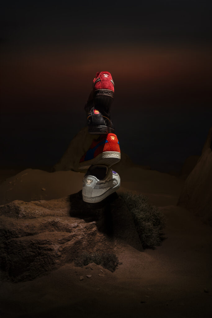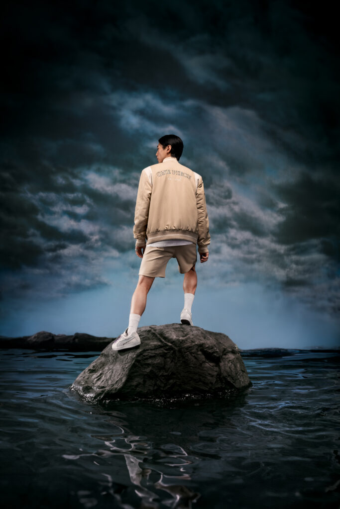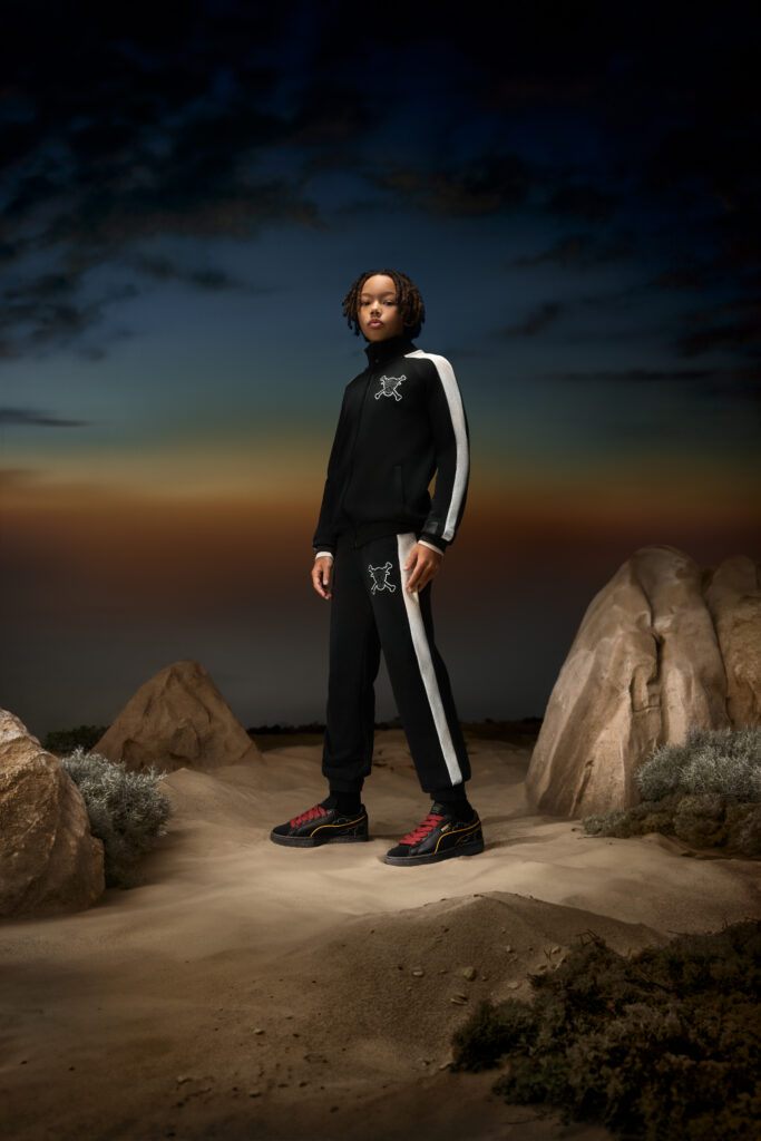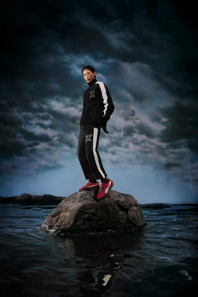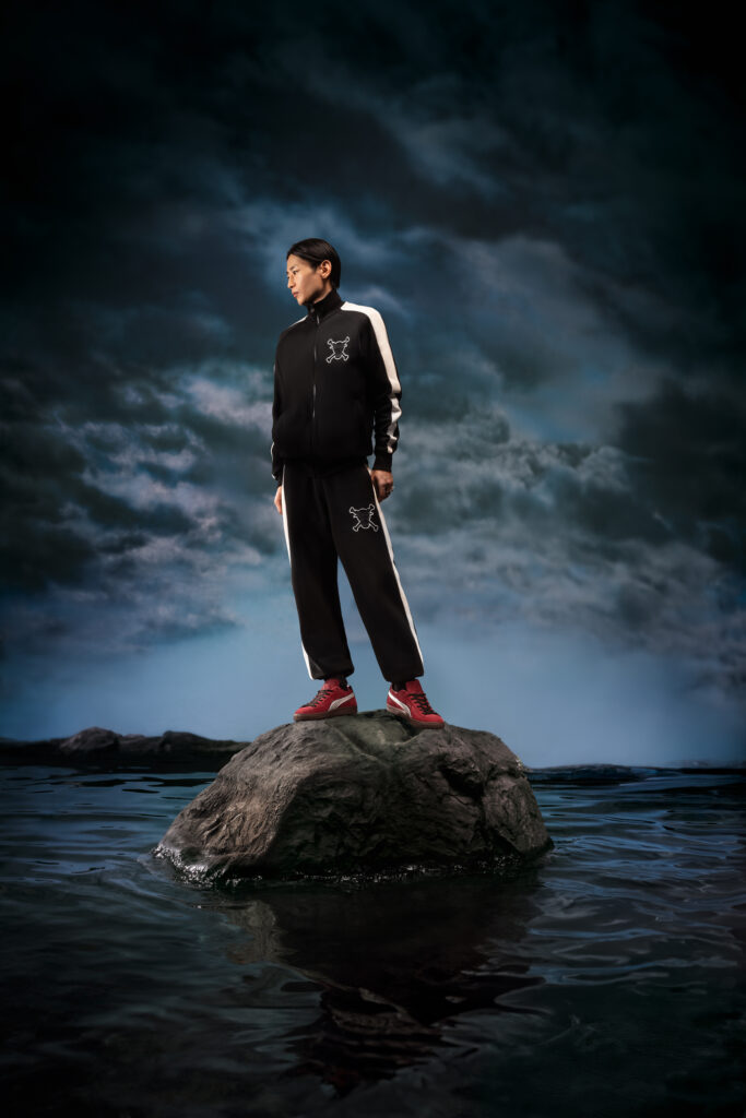 For footwear, the collection’s four expressive PUMA Suedes are inspired by the Four Emperors: Straw Hat Luffy, Red-Haired Shanks, Blackbeard Teech, and Buggy the Genius Jester. Each of these figures is alluded to through elevated detailing like a cloud-shaped Formstrip representing Gear5 Luffy and scar-mark embroidery nodding to Shanks. Finally, custom packaging and special gold medallion hangtags come with each sneaker.
