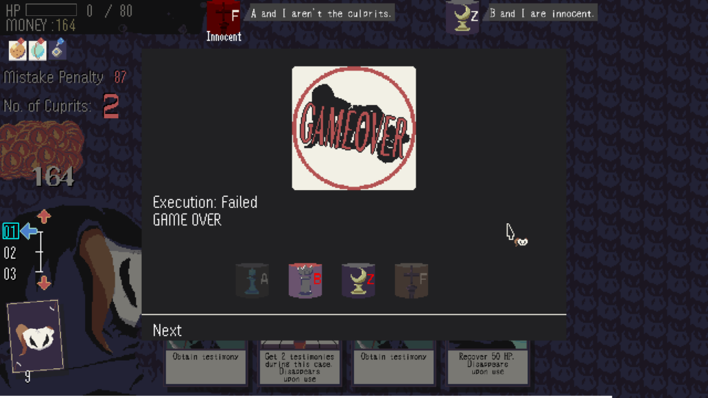 Once you either get a Game Over or beat the game, you will receive a report detailing how well you did as a detective reaper. Here, you can see how much time you took, how many mistakes you made, how many cards you used, and the total amount of money you spent on your run. If you manage to beat the game, you can try to surpass your own records in another playthrough. Even if you’ve beaten it once, the roguelite elements will make sure to keep you on your toes. Feel free to share your results with others on social media and compete with fellow players.