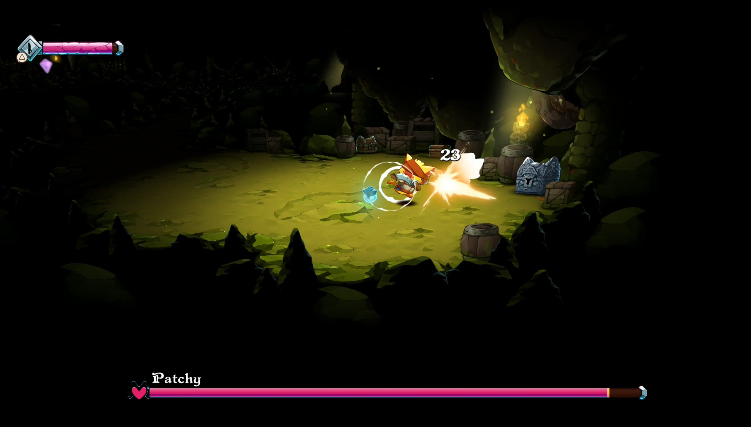Speaking of which, the fighting in-game is simple-yet-meaty enough to warrant repeated playthroughs. Combat is real-time; you attack with either melee or ranged attacks, as well as cast spells for more elemental damage (or heal), and can even dodge attacks. Some weapons you get like the shield puts you in a defense stance after an attack so you can take hits and send them back. Other weapons give you special dodge properties, and extra artifacts can be tacked onto your cat pirate for additional passives and buffs.