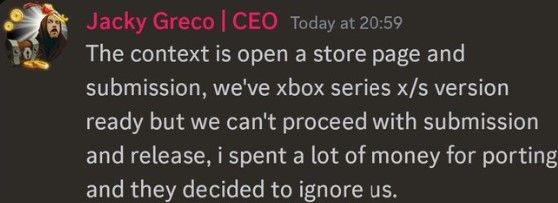 [Update: 3/9/2024, 10am GMT+8] Jyamma Games CEO Jacky Greco said the following on Discord concerning the Xbox delay news, blaming Microsoft as a whole for this.