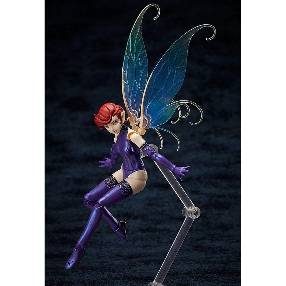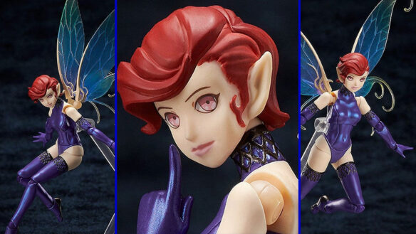 Pixie the Fairy (using Shin Megami Tensei 1’s design from artist Kazuma Kaneko) comes with a stand that suspends her while she’s posed in flight, and comes with the standard amount of Figma joints for a variety of poses. She also comes with two different face plates, as well as awesome gradient colours for her trademark wings. She stands mid-sized at 125mm, but you be the judge via the official pictures below.