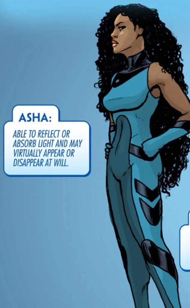 In the comics, Asha is a minor and obscure character with the power to reflect or absorb light.