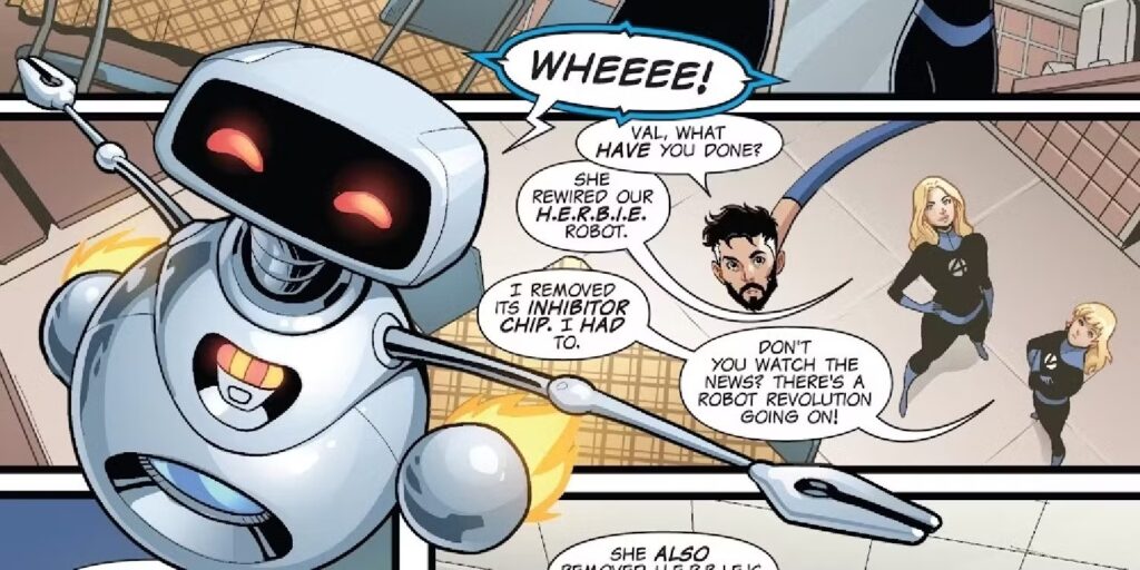 Meanwhile, H.E.R.B.I.E. makes his live-action debut for the first time. In the comics, H.E.R.B.I.E. was created by Mister Fantastic and Master Xar of the Xandarians, who hoped that the robot could aid their search for Galactus. Now, he’s just their ally and part of the family as a sentient robot.