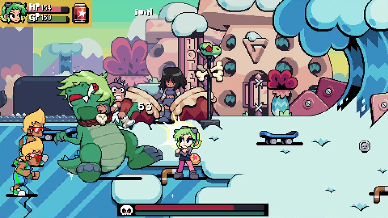 The duo aren’t alone: they enlist the help of the reformed League of Evil Exes members like Matthew Patel, Lucas Lee, Roxy Richter, Robot-01 (representing The Twins), and the ex-big bad himself Gideon Graves. For those who are up to speed in the lore, Scott Pilgrim EX takes place in what seems to be an alternate universe that kinda follows the established canon in Scott Pilgrim Takes Off, hence the playable ex-villains from the live-action movie.