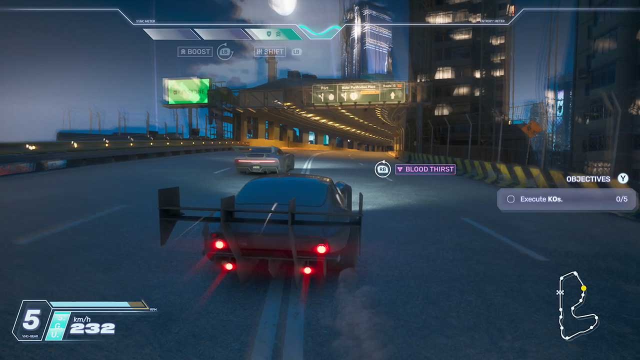 Through the Echo system, you can use the Sync meter to Boost and prop up a Shield. To gain Sync meter, you have to keep a consistent level of speed when driving, drift a lot, and even press the left bumper/L1 to do an Active Shift (which speeds you up a bit plus get you Sync meter). When you use Sync, it converts to Entropy, which you use to do Strikes and Overdrive. Strikes boosts your speed and makes anyone you collide with explode. Overdrive is the extreme version; every vehicle you collide with explode, but so do you if you touch any track barrier.