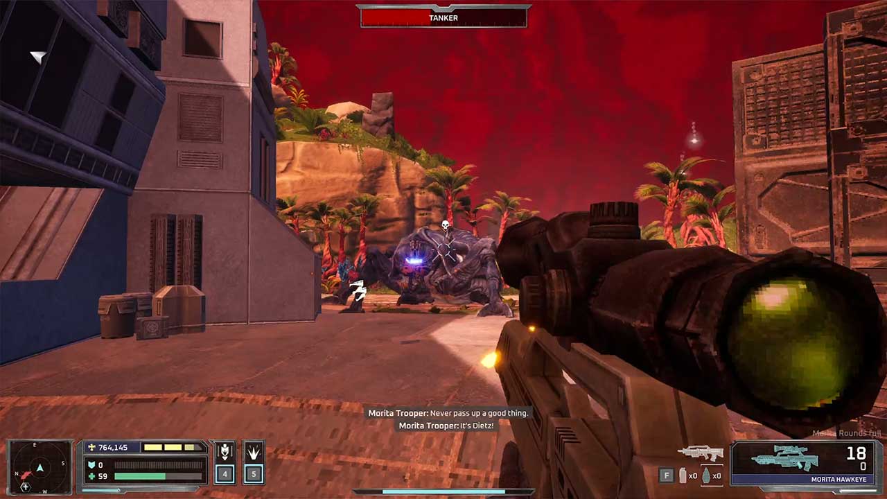 Combine all of these and more I haven’t mentioned, and you have a helluva swarm to deal with. Apart from crowd control and health preservation (these bugs hit hard and fast), the other challenging aspect of Starship Troopers: Ultimate Bug War! is ammo management. You will run out of ammo frequently due to the numbers and infinite respawns of the opposition, so you need to figure out where ammo and health/armour crates are (via red flares). They are also limited, so you cannot rely on them too much.