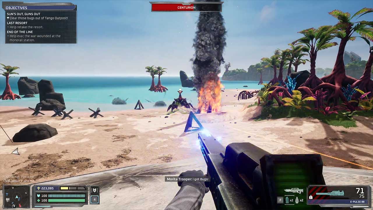 Combine all of these and more I haven’t mentioned, and you have a helluva swarm to deal with. Apart from crowd control and health preservation (these bugs hit hard and fast), the other challenging aspect of Starship Troopers: Ultimate Bug War! is ammo management. You will run out of ammo frequently due to the numbers and infinite respawns of the opposition, so you need to figure out where ammo and health/armour crates are (via red flares). They are also limited, so you cannot rely on them too much.