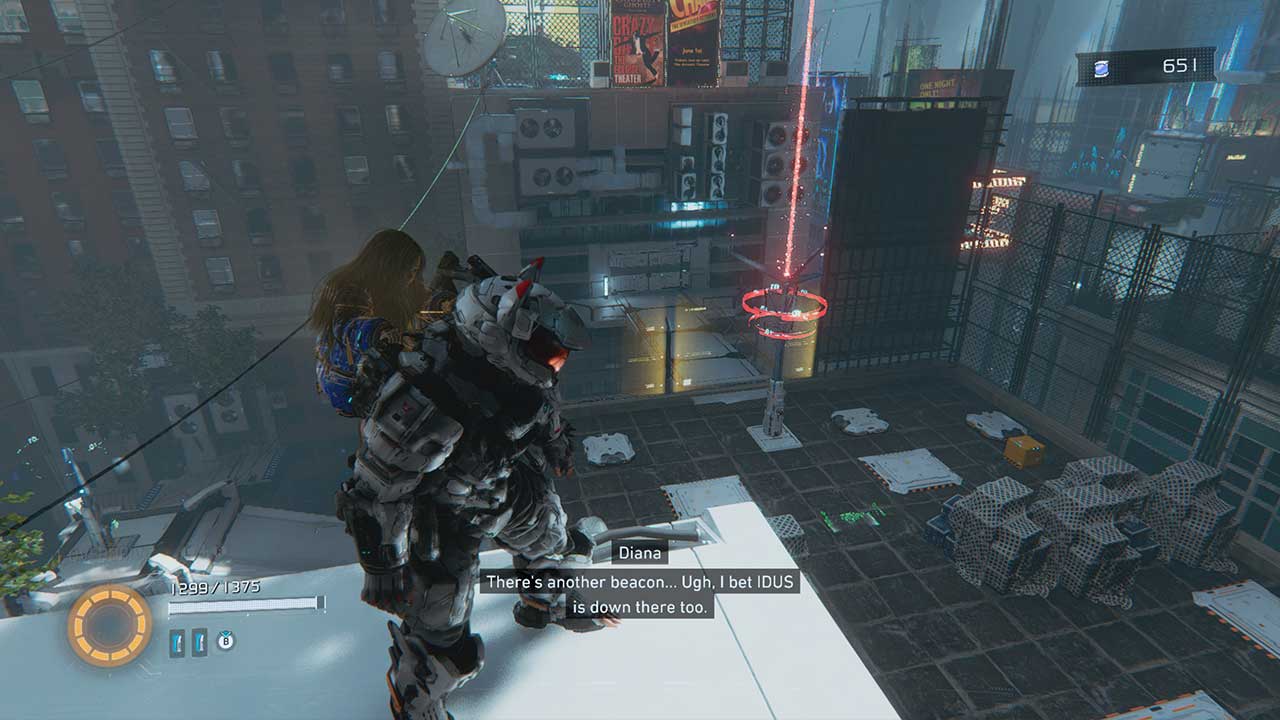 The game’s biggest hook is its shooting-hacking mechanics which perfectly overlays over one another. As Hugh, you aim and shoot bots attacking you with any weapon you find: your handy space pistol, the space shotgun, the charged shot railgun, and so forth. All bots are protected, so you need Diana’s literal over-the-shoulder help to hack through their defences. Using the Xbox controller as reference, you aim and fire by holding the left and right trigger respectively while moving the reticule around with the left analog stick. On the right side of the screen you see the hacking board; you move your hacking cursor by using the XYAB face buttons that moves it around (think d-pad controls but using said buttons). You need to have the hacking cursor through blue and yellow nodes and then complete it by hitting the green power button node; this will not only boost your damage but also lower the affected bot’s. Additional hacking debuffs can be added, and they can either stun enemies, or confuse them or just build up their Heat bar, making them easily prone to Hugh’s gun finishing moves because that’s clearly a Capcom thing to do. Which I am A-OK with.