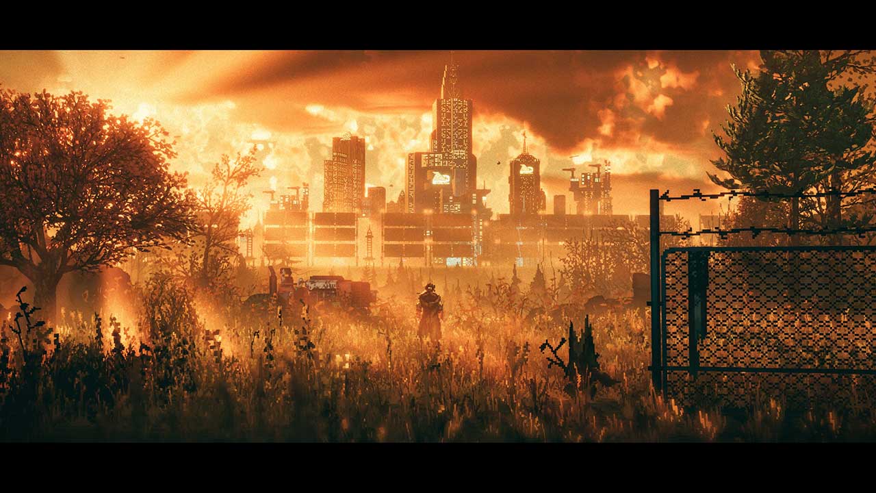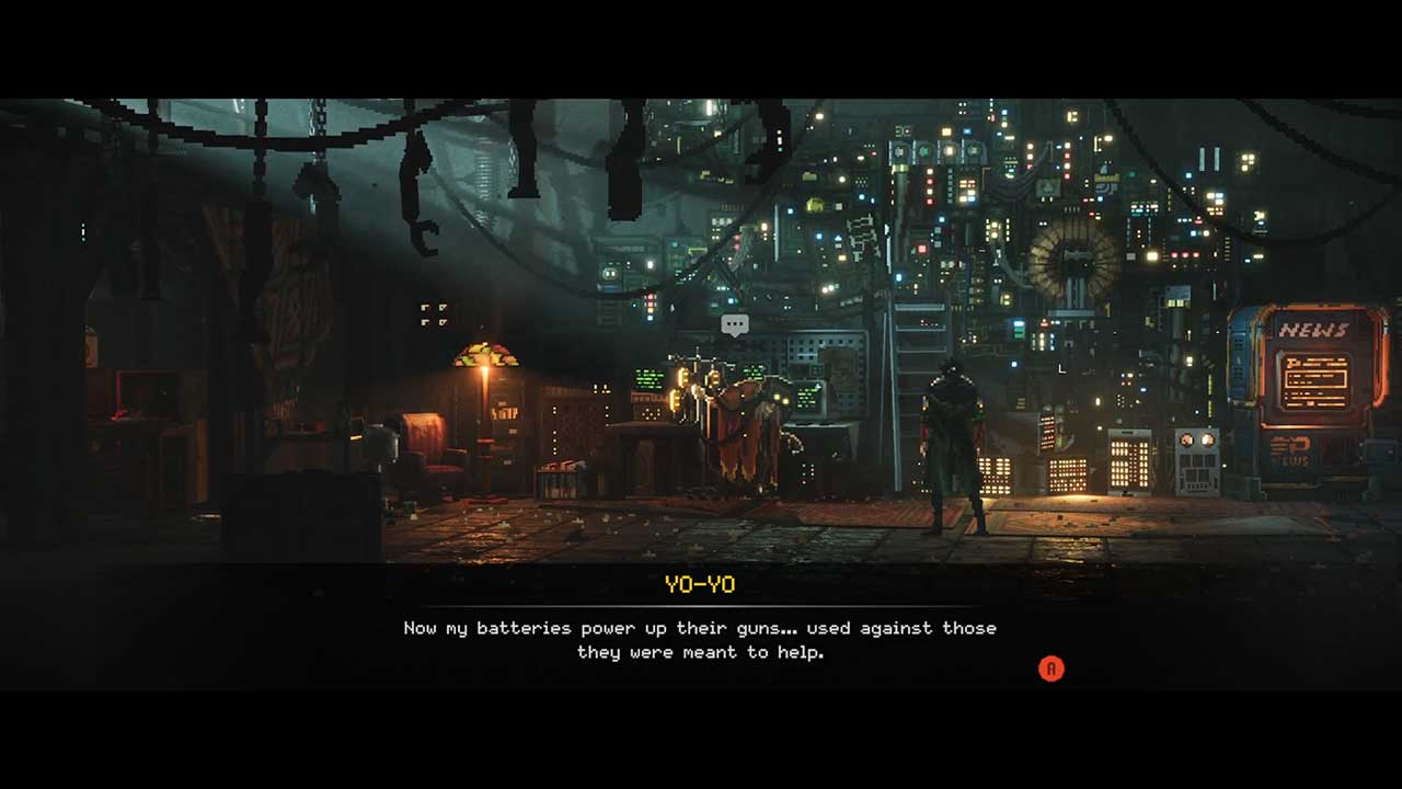 This cinematic adventure game does not miss a beat, nor wastes its time going through its action setpieces while giving you a break at appropriate times. It also knows when to punctuate the moment with a short vista shot of its sci-fi backdrops, establishing mood and context to your journey while also dazzling you with its deft use of colours and pixel art. Sad Cat Studios spent blood, sweat, and tears making each backdrop and landscape a work of art, and it pays off big time. My favourite moments include looking past a sky city vista of my destination, then being waylaid by a drone a second later in a tough chase sequence through the rooftops and construction area.