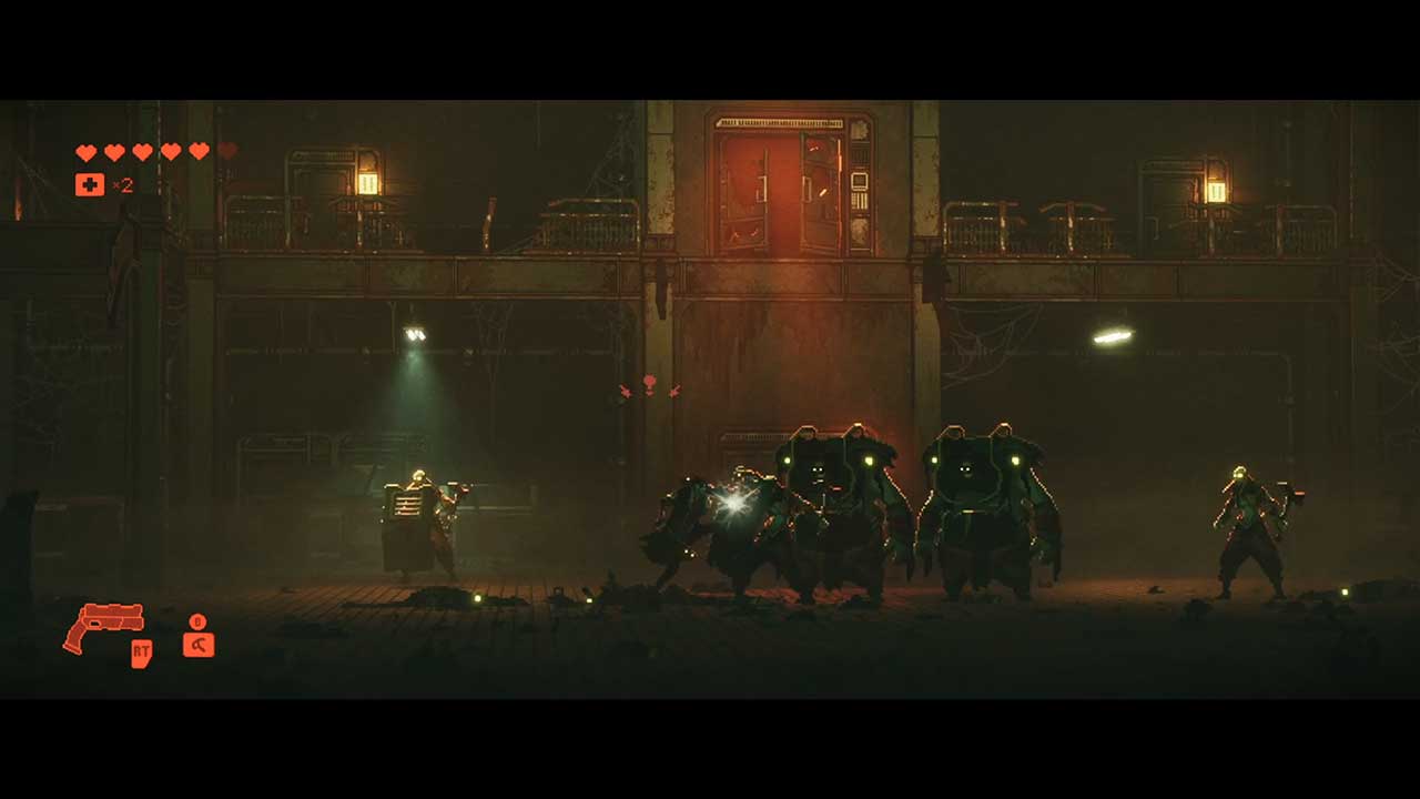 Does a 3D battle system with free-flow combat work in 2D? It does, but with one extra challenge: armoured enemies and regular enemies can share the same space, so when you’re landing hits, you prioritize the bigger threat, meaning you may be using the wrong attack at times when a targeting system would have solved that problem. Still, the fighting works for the most parts as you still need to use single-out methods to weed out the weak ones like the ranged attackers and shieldless grunts from the pack. What the game lacks in variety makes it up with volume and smooth controls; the kind that makes you feel good beating up waves of crooked cops and cannibals called Termites.